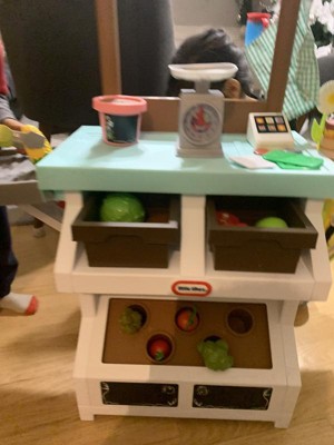 - PRODUCT INCLUDES: Over 30 role play accessories like fruits, veggies, bees, flowers and pot, scale, credit card reader, chalk and more.