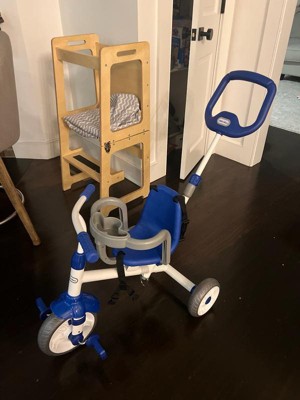 [This review was collected as part of a promotion.] I love this 3 in 1 little tikes tricycle! My daughter is in the age that start want to ride a bicycle but still can't reach the pedal so this a good product! We don't use the front tray cause it's too tight for her already, but everything else is perfect. The parent steering wheel is really helpful for driving the tricycle. The assembly is a little difficult and takes more time than I expected. Other than that, we love it that this tricycle can grow with our kid!
