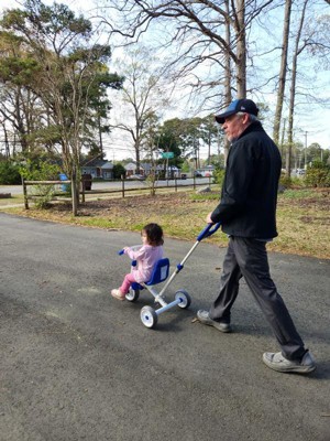 stage 1) push- parents have full control while pushing and steering the trike when child is too young to reach the pedals.