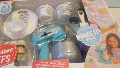 - 18 REALISTIC ACCESSORIES. This role play set includes 2 frosting containers with Make-It! Mix, 2 eggs with Make-It! Mix yolks, cupcake mix, detailed recipe card, functional stand mixer, egg carton, cupcake tin, mixer bowl, spatula, measuring cup, frosting mold, 4 candles, and plate.