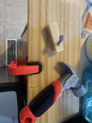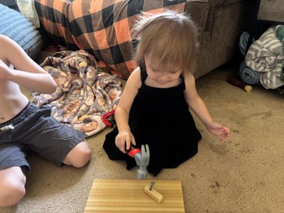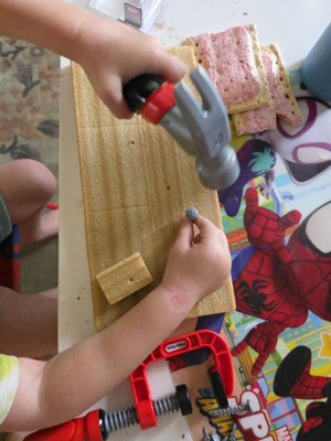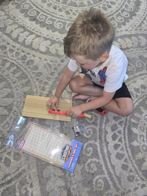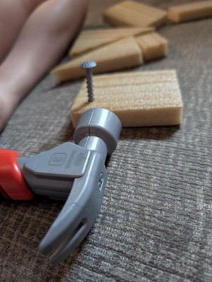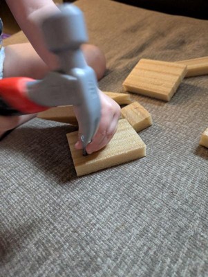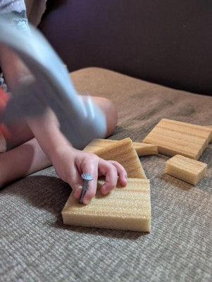 [This review was collected as part of a promotion.] This hammer and nail set is super cute, and the attention to detail in making it realistic (e.g., the little box for nails, design on the “wood,” etc.) made it extra fun! My preschooler was really excited to play with this set, but quickly became frustrated trying to hammer the nails into the foam board. It definitely requires some adult assistance to keep the nail straight and hit hard enough to push it through the foam board.