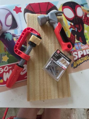 - 5 REALISTIC ACCESSORIES. This construction role play set includes a hammer, clamp, box of 10 nails, board of foam wood, and blueprint instructions.