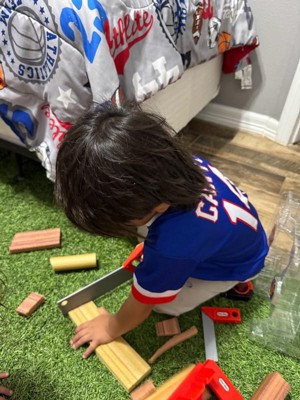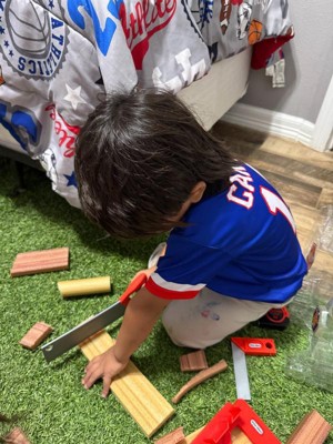 My son (4years old) loves this! Did he cut all the foam wood within the hour of opening it? Yup! But he’s still been cutting on it and loading the wood in to his toy trucks. The cut up wood is perfect for playing with his big trash truck and dump trucks. The marker, tape measure, all worked great. For the price point & the play time, it seems like a great purchase.