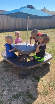 This Endless Adventures Fold 'n Store Picnic Table with Market Umbrella is the right size for kids. Seating on four sides makes this picnic table great for snacks, crafts and games. Kids can develop social skills while they play.