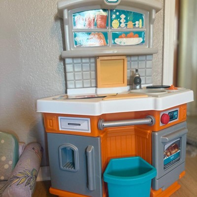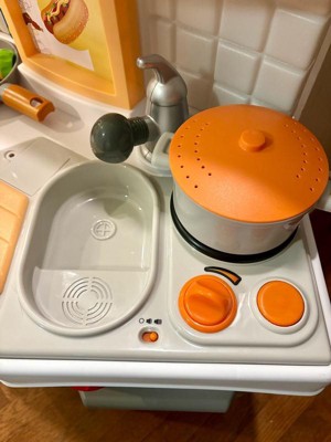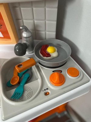 [This review was collected as part of a promotion.] My 2-year old is in love with this little kitchen set! It comes with some dishes and play food, which he loved. It was relatively easy to assemble but does require a screwdriver. The orange and blue retro vibe is so cute and the kitchen is compact so it doesn’t take up too much space in the playroom. My only concern is that some of the plastic seams are a little sharp and may have to be sanded so they aren’t a hazard.