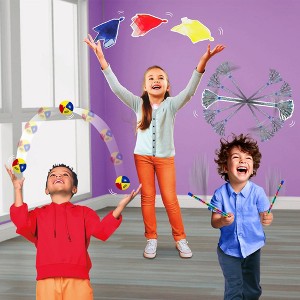 Ordered this for my 2 year old daughter. She loves to throw bouncy balls around the house and walks with anything she can play with . The first thing she went for was the 3 balls included I showed her what to do and she started laughing and threw them in the sky. The handkerchief she loved and also threw them in the sky and watched them drop down . She was distracted for hours with these. If you have a child who’s active and loves learning new things. This is great. She used the catch stick thinking they were pompoms.
