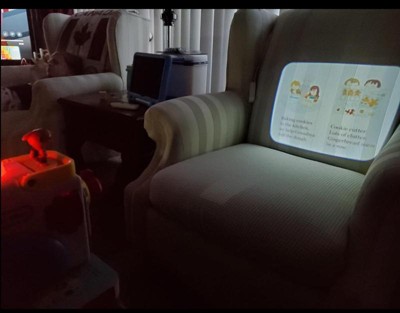 - READ ALONG – Develops beginning reading skills and word recognition as children see words projected and hear a narrator read them a story.