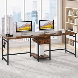 This two person desk features a double workstation with 2 drawers and storage shelf in the middle, providing a plenty of space for books, laptop, gaming setup and other office accessories. The long desk is manufactured from high-quality E0 board and stainless steel legs. The thickened metal frame ensures the super stability and thicker board is strong enough to support heavy duty load; The adjustable foot pads keep the large office desk stable on uneven ground and protect the floor from scratch.(Product Size: 23.62"D x 78.74"W x 29.52"H)
