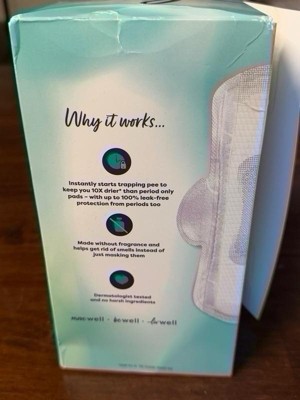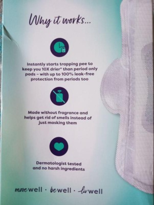 - Instantly starts trapping pee to keep you 10x drier* than period-only pads (*for heavier bladder leaks, 24 ml of fluid, vs. the leading period pad)
