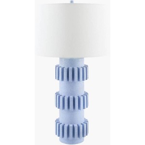 - Color: Body: Blue; Shade: White; Finial: Blue; Harp: Metallic - Nickel; Cord: Translucent