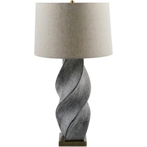 - Materials: Body: Ceramic; Base: Iron; Shade (Outside): Linen, Linen; Shade (Inside): Linen, Plastic; Finial: Iron