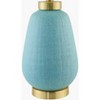- Color: Body: Teal; Base: Metallic - Brass; Shade (Outside): Beige; Shade (Inside): White; Finial: Metallic - Brass; Harp: Metallic - Brass; Cord: Translucent