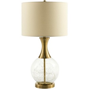 - Color: Body: Clear, Metallic - Brass; Base: Metallic - Brass; Shade: White; Finial: Metallic - Brass; Harp: Metallic - Brass; Cord: Translucent