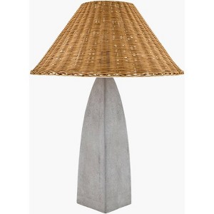 Illuminate your space with the timeless charm of the Mombeja accent table lamp. Standing at 23 inches tall, this Arts & Crafts Traditional style piece beautifully combines a hand-painted concrete body with an elegant iron finial and a rattan shade that softly diffuses light. Perfect for adding a warm, inviting glow to any room, this lamp effortlessly merges organic textures and industrial elements for a uniquely captivating look. Easy to care for, simply wipe clean with a dry cloth to maintain its stunning finish. Elevate your dcor and let the Mombeja table lamp become the standout feature in your home!