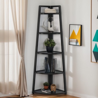LIVAREEmlen 5 Tier Corner Shelf with USB Plug,Glass Holder,Tall Standing Shelf for Wall Corner, Narrow Bookshelf