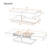 This coffee table combines innovative functionality with modern design. Its clever extendable tabletop, operated via a smooth-gliding mechanism, adapts seamlessly to small gatherings or compact daily use, ensuring flexibility in any space. For organization, the table features versatile storage solutions: open shelves for easy access to frequently used items, compact cubbies for tidying remotes and accessories, and a central open area for displaying books or decor, keeping your living space clutter-free yet stylish. Enhancing ambiance, the built-in 16-color LED strip¡ªcontrolled via Bluetooth app¡ªlets you effortlessly switch between vibrant party hues, warm reading lights, or calming gradients, adding a dynamic, tech-savvy touch to any occasion. Built on a durable MDF base, the table offers reliable stability, while its tool-free assembly ensures quick setup, perfect for busy households. Merging practicality, aesthetics, and smart features, this coffee table elevates both functionality and atmosphere in your home.