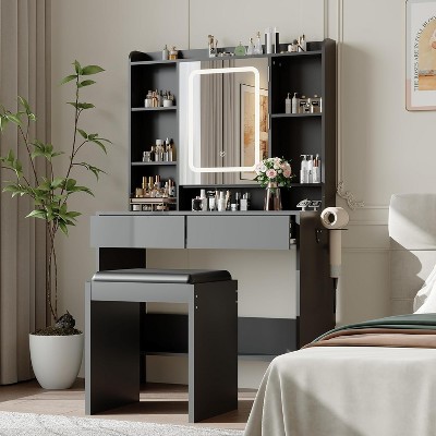 LIVAREEmlen Fashion Vanity Desk with Mirror and Lights for Makeup and Cushioned Chair,3 Color Lighting Brightness Adjustable,Dressing Table, White