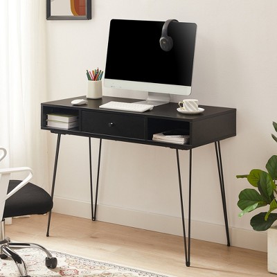 LIVAREEmlen Mid Century Desk with USB Ports and Power Outlet, Modern Writing Study Desk with Drawers, Multifunctional Home Office Computer Desk, Black