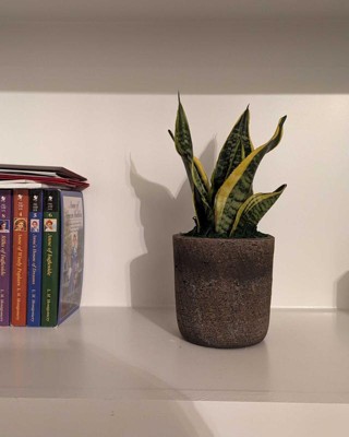 [This review was collected as part of a promotion.] Got this snake plant for our bookshelves to replace an older plant. It came shipped and was packaged nicely. It is a little bit smaller than I thought it would be, but it works in the space that I was thinking. It comes already in a greyish brown pot which is nice. The pot feels sturdy and there are stopper on the bottom of it too which is nice. Overall I like it and it looks nice on the shelf. I received an incentive to write this review.