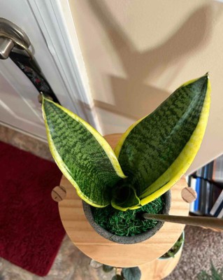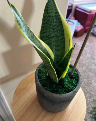 [This review was collected as part of a promotion.] This snake plant is great! This type of plant is very difficult to kill so a great choice for someone like me with a black thumb. The container it is planted in is a concrete like planter, which is elegant and pretty for my decor. The plant has some slightly less slightly green painted moss on the bottom of the plant where the dirt would be. I’m guessing it’s decorative but I do t really like it. I received an incentive to write this review.