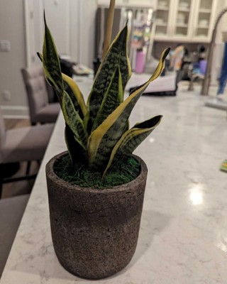 [This review was collected as part of a promotion.] This snake plant is great! This type of plant is very difficult to kill so a great choice for someone like me with a black thumb. The container it is planted in is a concrete like planter, which is elegant and pretty for my decor. The plant has some slightly less slightly green painted moss on the bottom of the plant where the dirt would be. I’m guessing it’s decorative but I do t really like it. I received an incentive to write this review.