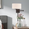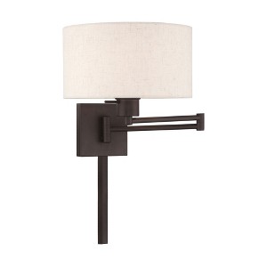 Material: Steel, Finish Color: Bronze, Width: 11", Height: 11", Depth: 24.25", Height From Outlet Box: 8.75", Backplate Width: 5", Lamping Type: Incandescent, Number Of Bulbs: 1, Wattage: 100 Watts, Moisture Rating: Dry Rated, Desc: Add this versatile swing arm wall lamp bedside or above a favorite reading chair to enjoy more light where you need it. The antique brass finish is transitional while the oatmeal fabric shade offers subtle texture. Shade Included: Yes. ,