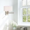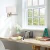 Material: Steel, Finish Color: Brushed Nickel, Width: 11", Height: 11", Depth: 24.25", Height From Outlet Box: 8.75", Backplate Width: 5", Lamping Type: Incandescent, Number Of Bulbs: 1, Wattage: 100 Watts, Moisture Rating: Dry Rated, Desc: Add this versatile swing arm wall lamp bedside or above a favorite reading chair to enjoy more light where you need it. The antique brass finish is transitional while the off-white fabric shade offers subtle texture. Shade Included: Yes. ,