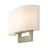 Material: Steel, Finish Color: Antique Brass, Width: 13", Height: 9", Depth: 3.95", Height From Outlet Box: 3.25", Backplate Width: 10", Backplate Length: 6", Lamping Type: Incandescent, Number Of Bulbs: 2, Wattage: 40 Watts, Moisture Rating: Dry Rated, Desc: Raise the style bar with an ADA wall sconce in a handsome and versatile contemporary manner. This two light wall sconce comes in an antique brass finish with a rectangular oatmeal fabric hardback shade.,