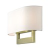 Material: Steel, Finish Color: Antique Brass, Width: 15", Height: 9.5", Depth: 3.95", Height From Outlet Box: 3.25", Backplate Width: 10", Backplate Length: 6", Lamping Type: Incandescent, Number Of Bulbs: 2, Wattage: 40 Watts, Moisture Rating: Dry Rated, Desc: Raise the style bar with a designer large ADA sconce in a handsome and versatile contemporary manner. This two light wall sconce comes in an antique brass finish with a rectangular off-white fabric hardback shade.,