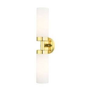Collection: Aero, Material: Steel, Finish Color: Polished Brass, Width: 19.25", Height: 4.25", Depth: 4", Height From Outlet Box: 9.63", Backplate Width: 4.25", Backplate Length: 0.63", Lamping Type: Incandescent, Number Of Bulbs: 2, Wattage: 60 Watts, Moisture Rating: Dry Rated, Desc: Add a dash of character and radiance to your home with this vanity sconce. This two-light fixture from the Aero Collection features an antique brass finish with two satin opal white glass cylinder shades on either side. The clean lines of the back plate complement the cylindrical glass shades creating a minimal, sleek, urban look that works well in most decors. This fixture adds upscale charm and contemporary aesthetics to your home. Mounting Direction: Up or Down / Shade Included: Yes. ,