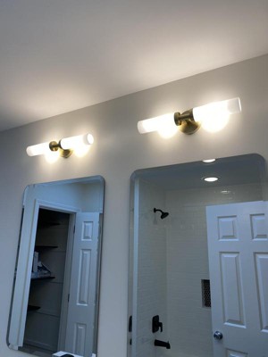 Collection: Aero, Material: Steel, Finish Color: Satin Brass, Width: 18", Height: 4.25", Depth: 4", Height From Outlet Box: 9", Backplate Width: 4.25", Backplate Length: 0.75", Lamping Type: Incandescent, Number Of Bulbs: 2, Wattage: 60 Watts, Moisture Rating: Dry Rated, Desc: With the sleek contemporary design, the Aero bath bar casts a soft, flattering light which can be mounted horizontal or vertical. The tubular etched opal glass diffuses the light of two lamps. Available in brilliant polished chrome or a subdued brushed nickel. Mounting Direction: Up/Down / Shade Included: Yes. ,
