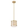 Collection: Arabesque, Material: Steel, Finish Color: Soft Gold, Width: 7", Height: 10.25", Hanging Method: Stem, Lamping Type: Incandescent, Number Of Bulbs: 1, Wattage: 40 Watts, Moisture Rating: Dry Rated, Desc: Our Arabesque one light mini pendant will add refined style and a hint of mystery to your decor. The off-white fabric hardback shade creates a warm illumination, while the light brings to life the intricate soft gold cutout pattern.,