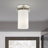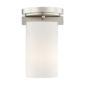 Collection: Astoria, Material: Steel, Finish Color: Brushed Nickel, Width: 5", Height: 8.25", Hanging Method: Flush, Lamping Type: Incandescent, Number Of Bulbs: 1, Wattage: 100 Watts, Moisture Rating: Damp Rated, Desc: The minimalist Astoria collection draws the eye to the soft, warm glow of the light emitted from the cylindrical satin opal etched glass shades available in a subdued brushed nickel or soft olde bronze. Canopy Included: Yes / Shade Included: Yes / Canopy Diameter: 5.00. ,