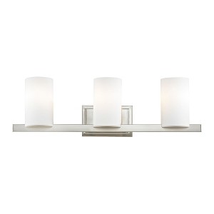 Collection: Astoria, Material: Steel, Finish Color: Brushed Nickel, Width: 26", Height: 7.5", Depth: 6.25", Height From Outlet Box: 5", Backplate Width: 7.25", Backplate Length: 5", Lamping Type: Incandescent, Number Of Bulbs: 3, Wattage: 100 Watts, Moisture Rating: Dry Rated, Desc: The minimalist Astoria collection draws the eye to the soft, warm glow of the light emitted from the cylindrical satin opal etched glass shades available in a brilliant polished chrome, a subdued brushed nickel or a soft olde bronze. Mounting Direction: Up/Down / Shade Included: Yes. ,