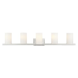 Collection: Astoria, Material: Steel, Finish Color: Brushed Nickel, Width: 43.75", Height: 7.5", Depth: 6.25", Height From Outlet Box: 2.5", Backplate Width: 7.25", Backplate Length: 5", Lamping Type: Incandescent, Number Of Bulbs: 5, Wattage: 100 Watts, Moisture Rating: Dry Rated, Desc: The minimalist Astoria collection draws the eye to the soft, warm glow of the light emitted from the cylindrical satin opal etched glass shades available in a brilliant polished chrome, a subdued brushed nickel or a soft olde bronze. Mounting Direction: Up/Down / Shade Included: Yes. ,