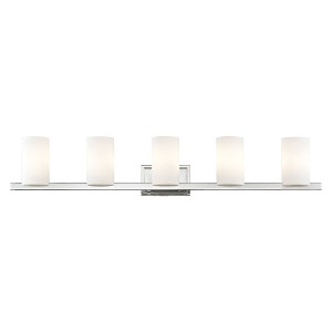 Collection: Astoria, Material: Steel, Finish Color: Polished Chrome, Width: 43.75", Height: 7.5", Depth: 6.25", Height From Outlet Box: 2.5", Backplate Width: 7.25", Backplate Length: 5", Lamping Type: Incandescent, Number Of Bulbs: 5, Wattage: 100 Watts, Moisture Rating: Dry Rated, Desc: The minimalist Astoria collection draws the eye to the soft, warm glow of the light emitted from the cylindrical satin opal etched glass shades available in a brilliant polished chrome, a subdued brushed nickel or a soft olde bronze. Mounting Direction: Up/Down / Shade Included: Yes. ,