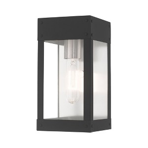 Collection: Barrett, Material: Steel, Finish Color: Scandinavian Gray, Width: 5", Height: 9.75", Depth: 5", Height From Outlet Box: 4.75", Backplate Width: 4.88", Backplate Length: 9.63", Lamping Type: Incandescent, Number Of Bulbs: 1, Wattage: 100 Watts, Moisture Rating: Dry Rated, Desc: Made of stainless steel this charming, bronze finish outdoor wall lantern has a versatile look that can be placed almost anywhere. The antique brass accent & clear glass adds a traditional touch to the clean, transitional-contemporary lines.,