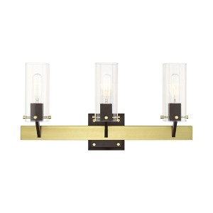 Collection: Beckett, Material: Steel, Finish Color: Satin Brass, Width: 23.75", Height: 12", Depth: 5.5", Height From Outlet Box: 9.5", Backplate Width: 5.13", Backplate Length: 0.88", Lamping Type: Incandescent, Number Of Bulbs: 3, Wattage: 60 Watts, Moisture Rating: Dry Rated, Desc: Illumite your home with a bright design from the Beckett collection. This three light vanity sconce is adorned with rounded corners clear square glass shades, emulates a mid-century modern style made popular in the 50s and 60s. The satin brass frame is combined with bronze finish accents. Perfect for a contemporary or transitiol luxury bathroom setting. Mounting Direction: Up or Down / Shade Included: Yes. ,