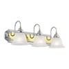 Collection: Belmont, Material: Steel, Finish Color: Polished Chrome, Width: 24", Height: 8.5", Depth: 8.5", Height From Outlet Box: 5", Backplate Width: 24", Backplate Length: 4.75", Lamping Type: Incandescent, Number Of Bulbs: 3, Wattage: 100 Watts, Moisture Rating: Dry Rated, Desc: The Belmont bath bracket with sweeping antique brass arcs framing elegant, alabaster swirl glass. The Belmont collection is warm and traditional and will easily become the focal point of your special room.,