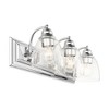 Collection: Birmingham, Material: Steel, Finish Color: Polished Chrome, Width: 24", Height: 7", Depth: 7", Height From Outlet Box: 4.25", Backplate Width: 24", Backplate Length: 4.5", Lamping Type: Incandescent, Number Of Bulbs: 3, Wattage: 100 Watts, Moisture Rating: Dry Rated, Desc: Bring a beautiful new look to your bathroom or vanity area with this charming three-light vanity sconce from the Birmingham collection. A wide rectangular antique brass finish back plate supports three simple graceful arms that hold three hand blown clear glass shades. The clean lines of this updated classic will make this piece an appealing part of your home. Mounting Direction: Up or Down / Shade Included: Yes. ,