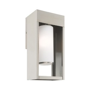 Collection: Bleecker, Material: Brass, Finish Color: Brushed Nickel, Width: 7.88", Height: 17", Depth: 6.25", Height From Outlet Box: 4.25", Backplate Width: 5.5", Backplate Length: 8.5", Lamping Type: Incandescent, Number Of Bulbs: 1, Wattage: 60 Watts, Moisture Rating: Dry Rated, Desc: The box-like solid brass body of this outdoor wall lantern has a thick frame that houses a satin opal white cylinder glass shade. The black finish give the thick, sturdy frame construction a contemporary look with distinct style. Shade Included: Yes. ,