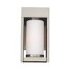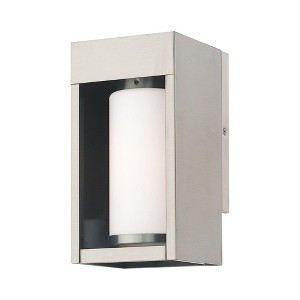 Collection: Bleecker, Material: Brass, Finish Color: Brushed Nickel, Width: 4.88", Height: 9.25", Depth: 5.25", Height From Outlet Box: 3.5", Backplate Width: 4.75", Backplate Length: 7", Lamping Type: Incandescent, Number Of Bulbs: 1, Wattage: 60 Watts, Moisture Rating: Dry Rated, Desc: The box-like solid brass body of this outdoor wall lantern has a thick frame that houses a satin opal white cylinder glass shade. The black finish give the thick, sturdy frame construction a contemporary look with distinct style. Shade Included: Yes. ,