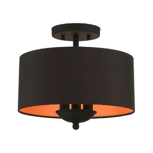 Collection: Bradhurst, Material: Steel, Finish Color: Black, Width: 12", Height: 10.25", Lamping Type: Incandescent, Number Of Bulbs: 3, Wattage: 40 Watts, Moisture Rating: Dry Rated, Desc: The three-light black finish Sentosa semi-flush has a modern and retro appeal. The hand-crafted black fabric hardback drum shade is set off by an inner silky orange fabric which creates a versatile effect. Perfect fit for the living room, dining room, kitchen or bedroom. Canopy Included: Yes / Canopy Diameter: 5.13 / Shade Included: Yes / Shade Dimensions: 12 x 5.5. ,