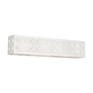 Collection: Calinda, Material: Steel, Finish Color: Polished Chrome, Width: 23.75", Height: 5", Depth: 3.9", Height From Outlet Box: 11.88", Backplate Width: 23.75", Backplate Length: 5", Lamping Type: Incandescent, Number Of Bulbs: 4, Wattage: 60 Watts, Moisture Rating: Dry Rated, Desc: The transitiol Calinda series adds refined style and a hint of mystery to your decor. The brushed nickel finish and an off-white handcrafted hardback shade create warm illumition, while soft light brings to life the intricate fretwork pattern. This large four-light vanity sconce will add a sophisticated and glamorous look to almost any interior design style. It will work great horizontally or vertically and you can place it in the hallway, living room, bathroom or bedroom. Mounting Direction: Up or Down. ,