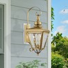 Collection: Cambridge, Material: Brass, Finish Color: Antique Brass, Width: 8.5", Height: 21.5", Depth: 10", Height From Outlet Box: 10", Backplate Width: 4.75", Backplate Length: 8", Lamping Type: Incandescent, Number Of Bulbs: 2, Wattage: 60 Watts, Moisture Rating: Dry Rated, Desc: This stylish antique brass outdoor wall lantern is a great way to update your home's exterior decor. A flat metal curved arm attaches the solid brass decorative housing to the square backplate while clear water glass protects the two bulbs.,