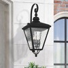 Collection: Cambridge, Material: Brass, Finish Color: Black, Width: 14.25", Height: 35", Depth: 16", Height From Outlet Box: 14.5", Backplate Width: 4.75", Backplate Length: 12", Lamping Type: Incandescent, Number Of Bulbs: 4, Wattage: 60 Watts, Moisture Rating: Dry Rated, Desc: This stylish bronze outdoor wall lantern is a great way to update your home's exterior decor. A flat metal curved arm attaches the solid brass decorative housing to the square backplate while clear water glass protects the four bulbs. Shade Included: Yes. ,