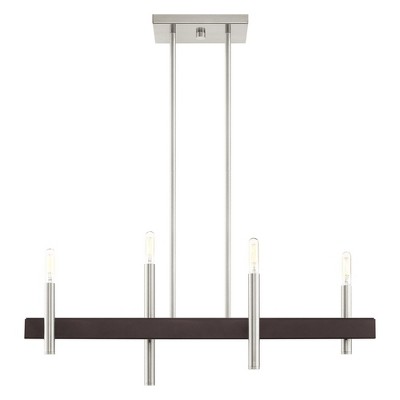 Collection: Capistrano, Material: Steel, Finish Color: Brushed Nickel, Width: 6", Height: 13.5", Length: 38", Hanging Method: Stem, Lamping Type: Incandescent, Number Of Bulbs: 2, Wattage: 120 Watts, Moisture Rating: Dry Rated, Desc: The Capistrano collection is presented in a satin brass finish with simple and elegant white finished shades. It defines mid-century lines of this Scandivian inspired collection. This two-light linear chandelier will complete the look of modern interior kitchen, dining room or home office. No. of Rods: 3 / Canopy Included: Yes / Shade Included: Yes / Canopy Diameter: 6 x 0.75 / Rod Length(s): 18.00. ,