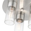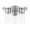 Collection: Carson, Material: Steel, Finish Color: Brushed Nickel, Width: 14", Height: 8.25", Hanging Method: Flush, Lamping Type: Incandescent, Number Of Bulbs: 3, Wattage: 40 Watts, Moisture Rating: Dry Rated, Desc: The Carson transitional three light flush mount will bring posh sophistication to your decor. The clear cylinder glass combined with the brushed nickel finish gives this piece a sleek, contemporary look.,