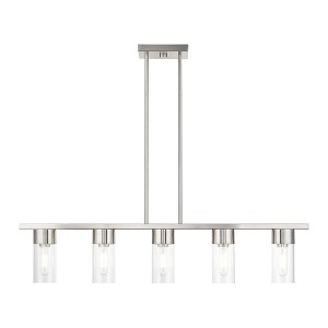 Collection: Carson, Material: Steel, Finish Color: Brushed Nickel, Width: 4.5", Height: 15", Length: 40", Hanging Method: Stem, Lamping Type: Incandescent, Number Of Bulbs: 5, Wattage: 300 Watts, Moisture Rating: Dry Rated, Desc: The Carson transitional five light linear chandelier will bring posh sophistication to your decor. The clear cylinder glass combined with the brushed nickel finish gives this piece a sleek, contemporary look.,