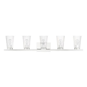 Collection: Cityview, Material: Steel, Finish Color: Polished Chrome, Width: 40", Height: 8", Depth: 5", Height From Outlet Box: 5.63", Backplate Width: 7.25", Backplate Length: 4.75", Lamping Type: Incandescent, Number Of Bulbs: 5, Wattage: 60 Watts, Moisture Rating: Dry Rated, Desc: Brighten up your bathroom vanity with the sleek look of the Cityview five light vanity sconce. The tapered clear glass shades and the polished chrome finish make a perfect match.,